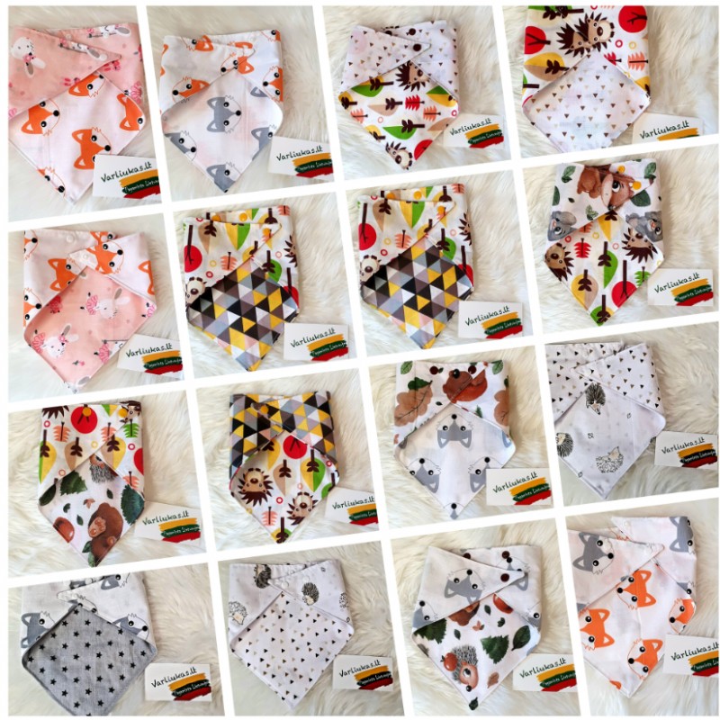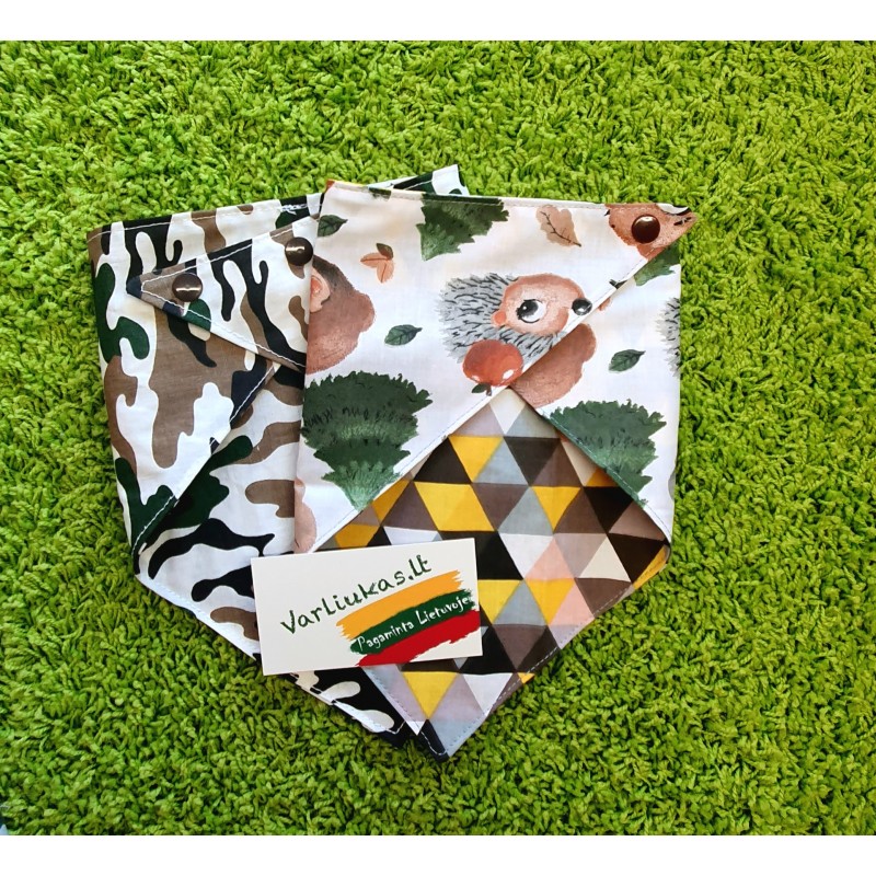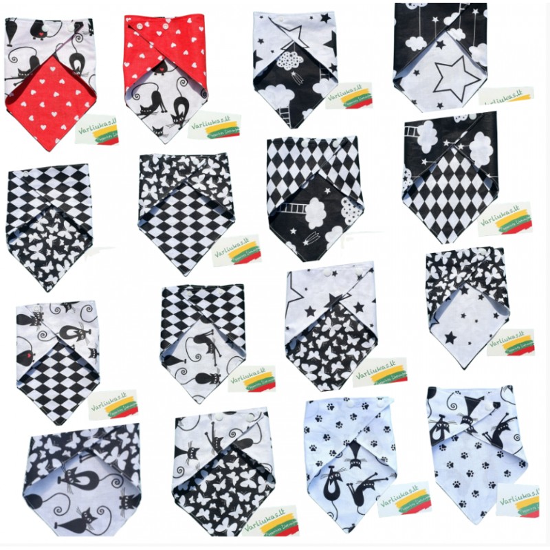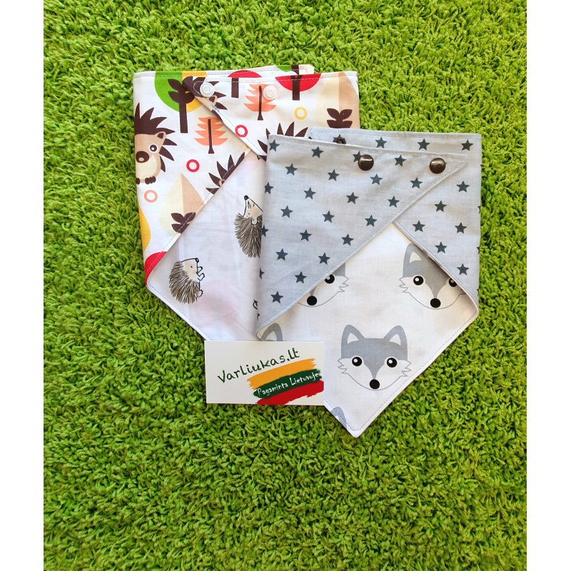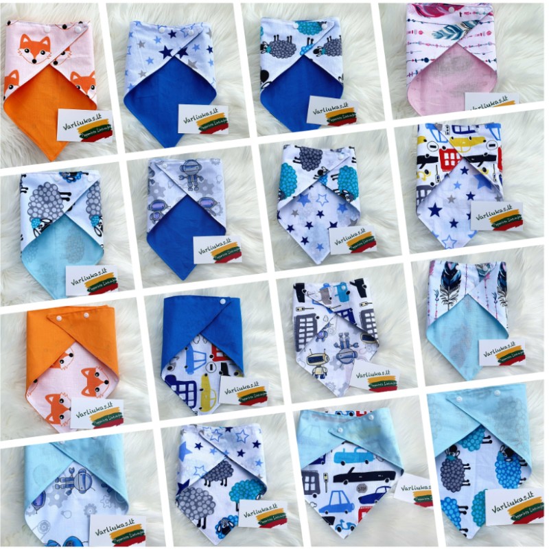 Kaklaskarės užsisega spaudžių pagalba, reguliuojasi dydis, tad tiks nuo paties mažiausio iki ~ 3 metukų. Kaklaskarės iš dviejų sluoksnių medvilnės audinio.